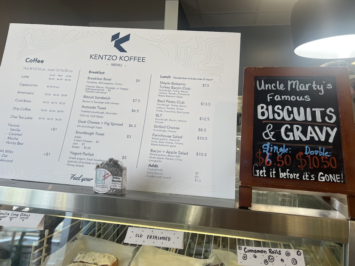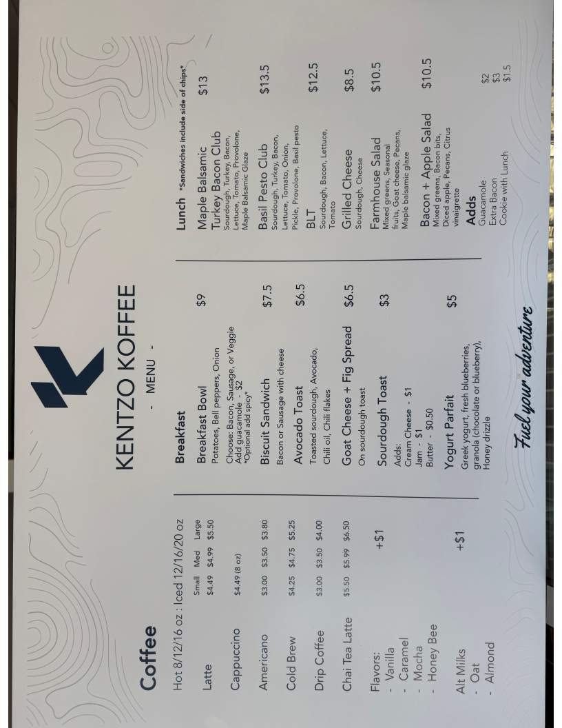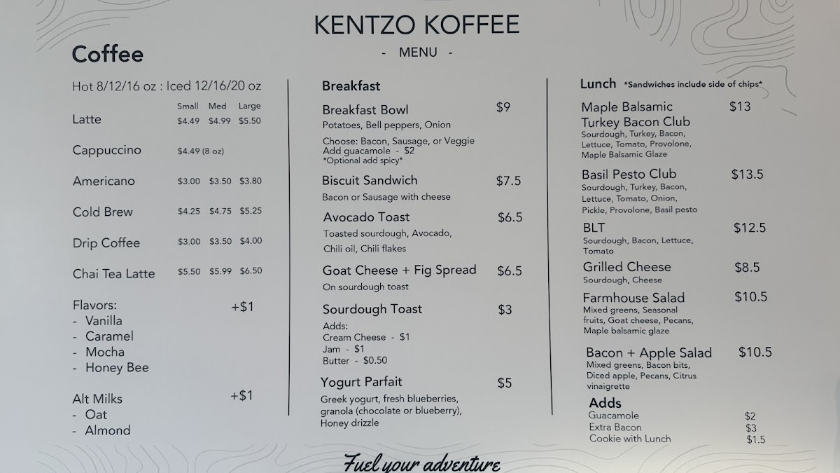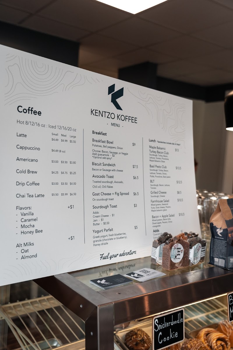 Kentzo Koffee Cafe offers a diverse and delightful menu, catering to both breakfast and lunch cravings, along with a wide range of coffee and non-coffee beverages. For coffee lovers, the cafe serves classic options like Latte, Cappuccino, Americano, and Cold Brew, alongside a variety of Signature Lattes such as the Honey Bee Latte, Vanilla Latte, Caramel Latte, Mocha Latte, and the bold Dirty Chai. If you prefer a lighter option, the Iced Latte, Iced Americano, and Cold Brew provide a refreshing alternative. The breakfast menu includes hearty choices like the Breakfast Bowl, Biscuit Sandwich, and Avocado Toast, with unique twists like Goat Cheese + Fig Spread and Sourdough Toast. The cafe also offers light bites such as Sourdough Toast and a Maple Balsamic lunch dish for those seeking something savory. For hot drink enthusiasts, the Americano, Latte, Cappuccino, and Cortado are all available. Additionally, the menu features Chai Tea, Hot Cocoa, and Lemonade for those looking for tea-based or non-caffeinated options. Kentzo Koffee Cafe perfectly blends both sweet and savory dishes with refreshing beverages, making it a cozy spot to enjoy a variety of flavors at any time of the day.